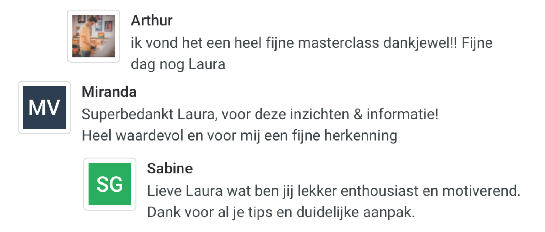 ✔ De masterclass duurt circa 2 uur, en er is ruimte om je vragen in te sturen. Je volgt de masterclass gewoon vanaf je telefoon of laptop. En geen zorgen, je bent niet zichtbaar in beeld.